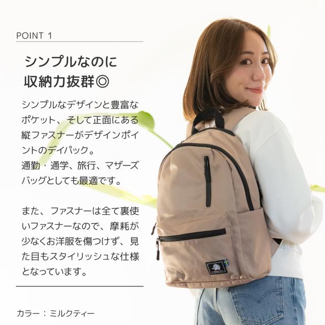 シンプルなデザインと豊富なポケット、そして正面にある縦ファスナーがデザインポイントのデイパック。