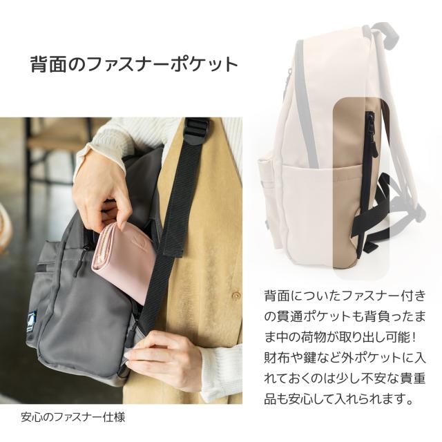背面についたファスナー付きの貫通ポケットも背負ったまま中の荷物が取り出し可能!