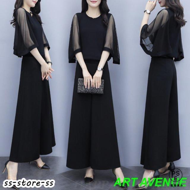 きれいなパンツ半袖上下ツーセット黒分けパーティードレス結婚式招待ドレス30代40代50代黒ドレスセットです