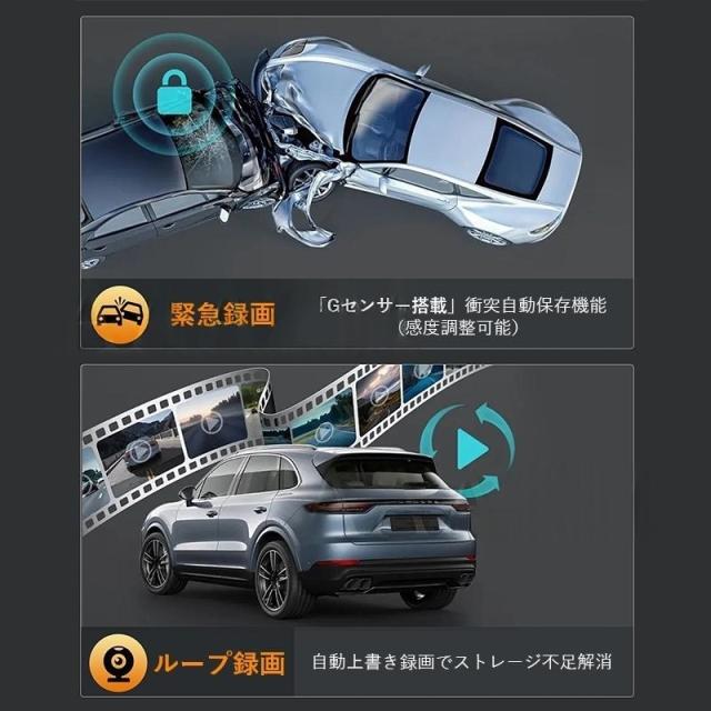 Wi-Fi接続機能内蔵:スマートフォンとの連携により、録画データの確認やダウンロードを簡単に操作可能。 Gセンサー衝撃検知機能:衝突や急ブレーキなどの振動を感知して自動的に重要なファイルを保護します。