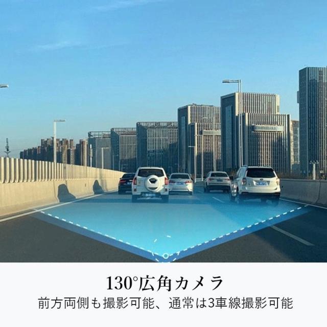 130°広角:広範囲を捉える広角レンズで、両サイドの車線や歩行者までしっかり確認できます。