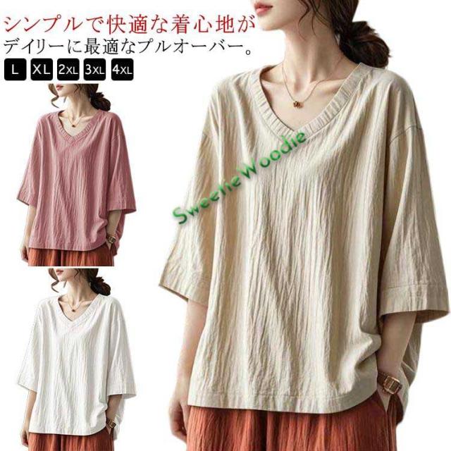 七分袖tシャツ カットソー 七分袖 レディース プルオーバー Vネック 七分袖 綿麻 春 夏 秋 トップス ゆったり インナー 大人 シンプル カジュ