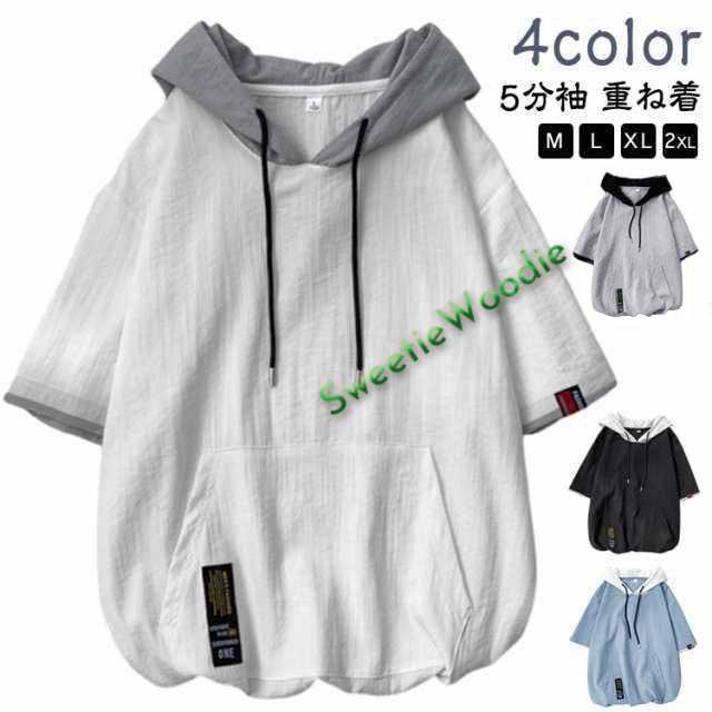 半袖パーカー シンプル おしゃれ 夏服 パーカー 薄手 フード付きtシャツ プルオーバーパーカー メンズ 切り替え レイヤード風 トップス 夏 春秋