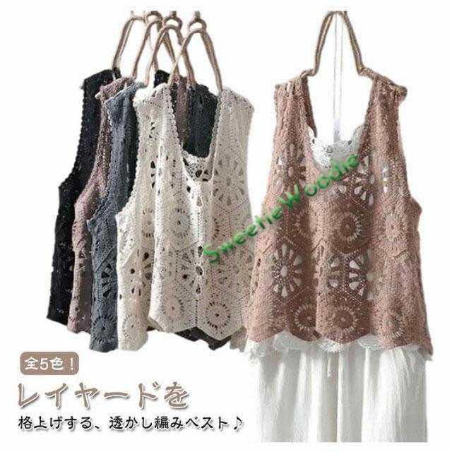 ニットベスト きれいめ 透かし編み 無地 春夏 レディース トップス プルオーバー かぎ編み 透け ベスト 綿 おしゃれ ベスト レイヤード カジュア