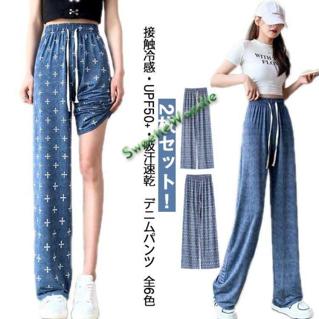 2枚セット デニムパンツ 接触冷感 レディース 速乾 UPF50+ デニム UVカット ボトムス デニム ひんやり ジーパン 2枚セット ストレート