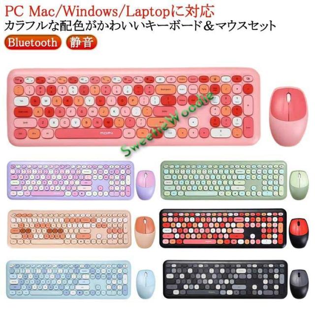 | カラフルな配色がかわいいキーボード&マウスセット。 ワイヤレスキーボードだけではなく、ワイヤレスマウスも付属される2点セットで経済的です。 どのボタンでもバランスがよく、快適で、静かなクリックができます。 Windows、Android、macOS、iOSなど様々な機器で使用できます。基本的にBluetooth搭載しているiPad、スマホ、PC等、各種の端末に対応します。 キーボードはパソコンやスマートフォンなど、Bluetoothを内蔵した機器とレシーバーなしで接続できます。 マウスは2.4GHzワイヤレステクノロジーを採用し、ドライバーのダウンロードや設定が不要で、PCにUSBレシバーを接続すればすぐに使えます。 最大10Mまで通信できるので、距離や位置に気にせず自由自在に移動できます。 ビジネスバッグでも場所を取らず、いつでも、どこでも持って行けます。 | |