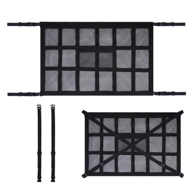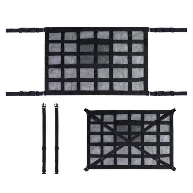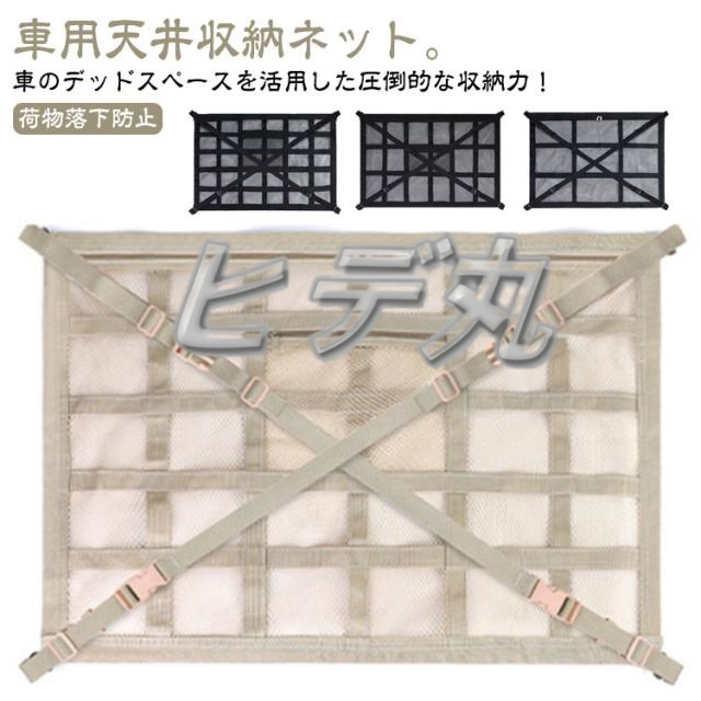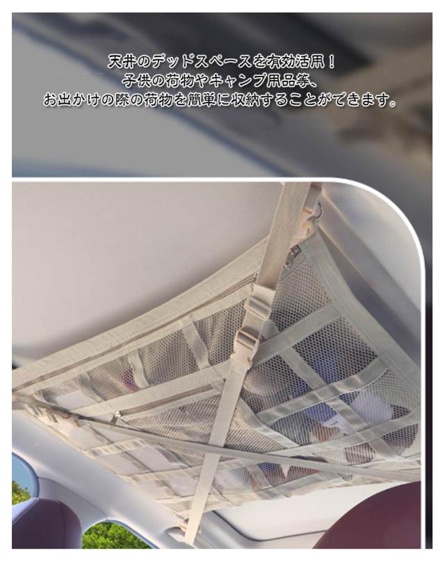 | 車用天井収納ネット。 車のデッドスペースを活用した圧倒的な収納力!天井のデッドスペースを有効活用!子供の荷物やキャンプ用品等、お出かけの際の荷物を簡単に収納することができます。 便利なダブルジッパーを採用!荷物を簡単に取り出せるよう、 ダブルジッパー仕様としました。荷物をネット内に収納でき、運転中に落ちてくる心配もありませ 立体二里構造による独度UP!荷物を載せるメッシュ部分を強化 するため、メッシュが重ならない 二重構造に設計しました。 使用方法:1.装着のための準備をします。 2.ベルトをグリップに通します。 3.バックルをクロスになるように 4.ネットが張るように長さを調整! | |