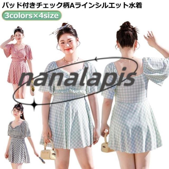 マタニティ 妊婦服 ワンピース マタニティ aラインワンピース 体型カバー ワンピース パッド付き 水着 水着 チェック柄 Vネック フリル袖 妊婦