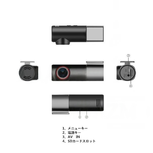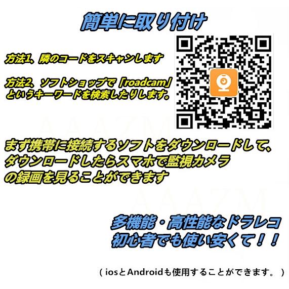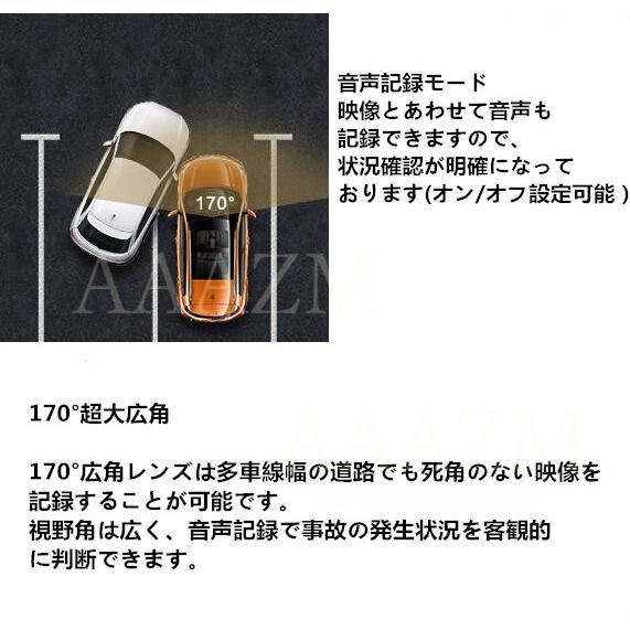 商品機能:ドライブレコーダーは駐車監視、WIFI搭載、Gセンサー、常時録画、ループ録画、衝撃録画、動体検知、スマホ連動、音声録音、後退時後方を映し出します