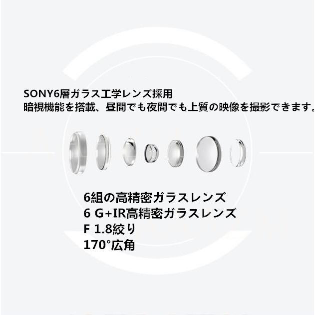 レンズ:6組のガラスレンズ、1赤外線フィルタ、水平114度、対角線170度、F 2.0絞り