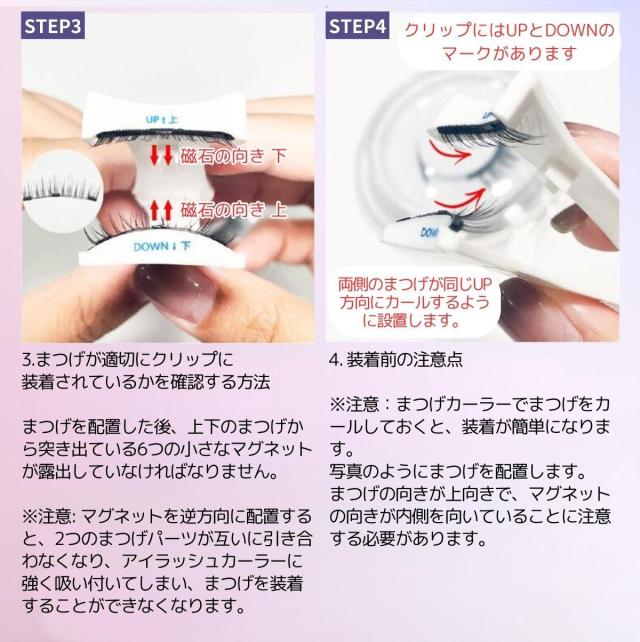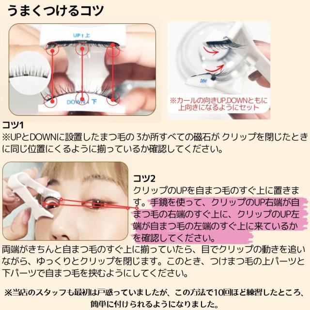 - 取り方が悪かったのか、ケースの磁石にまつ毛の磁石がくっついていて、まつ毛には磁石が両端にしかなく、使えませんでした。 また、磁石3つでは自まつ毛に装着した時、浮いた感じの部分があり、見た感じに違和感を感じました。 装着方法は思ったより簡単でした。