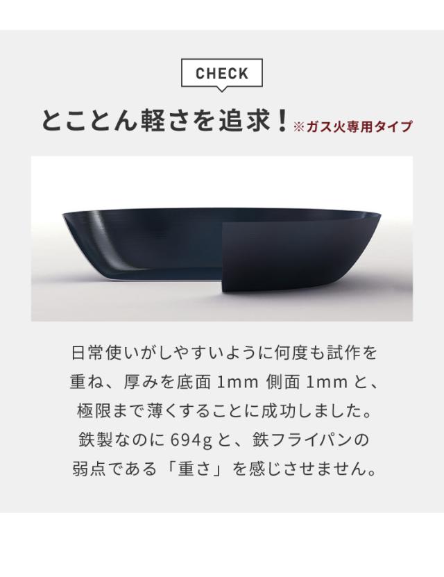 日常使いがしやすいように、何度も試作を重ね、厚みを底面1mm/側面1mmと、極限まで薄くすることに成功し、鉄製なのに694g(ガス火専用)を実現しました。