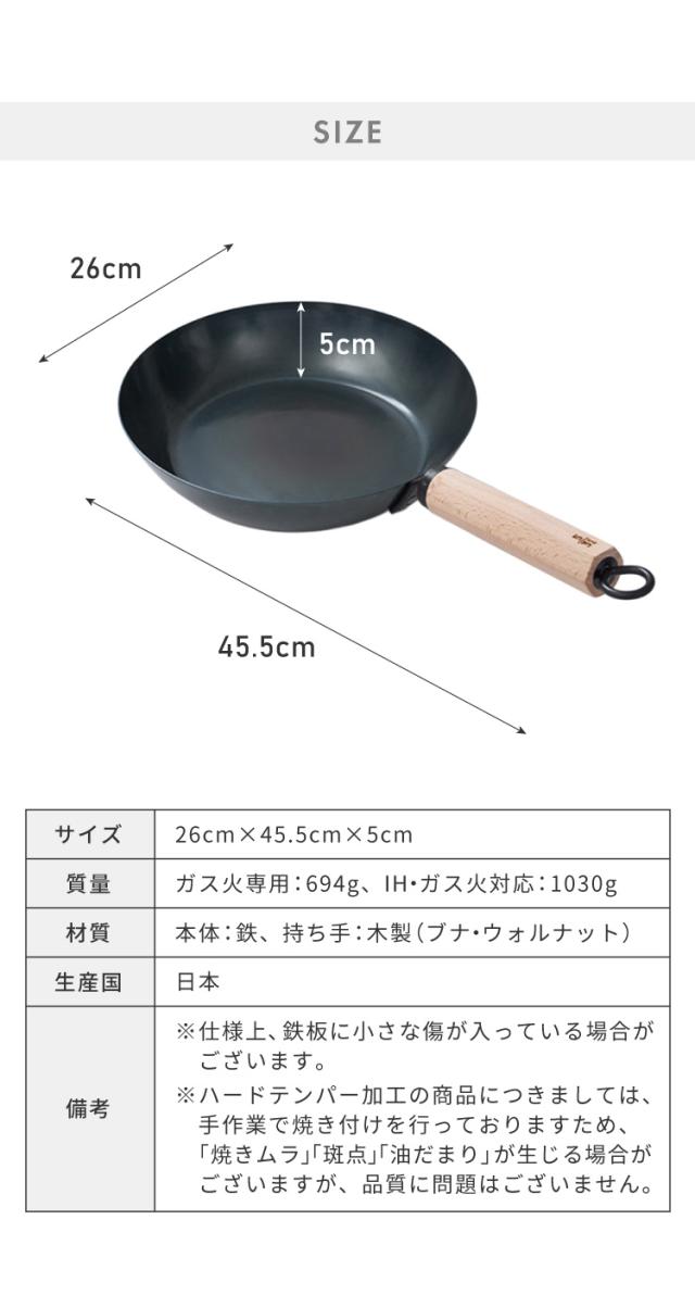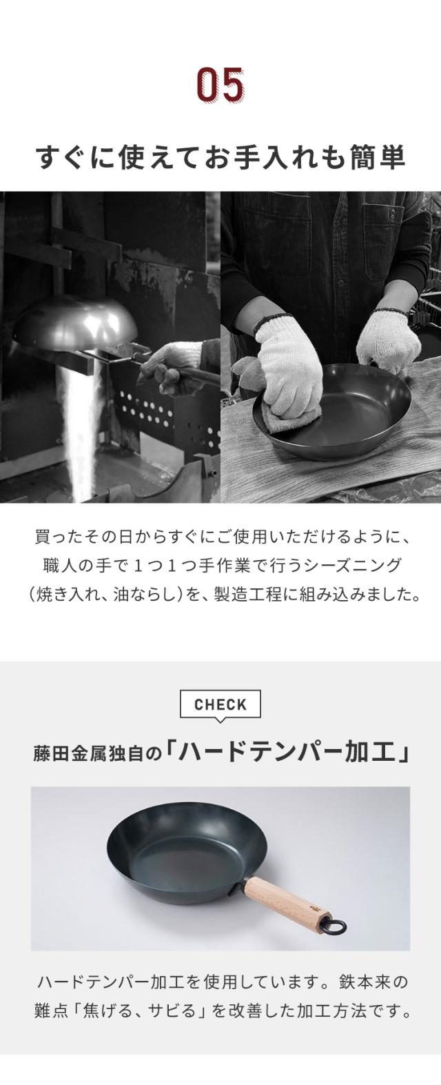 ※藤田金属のオリジナル技術ハードテンパー加工を使用。ハードテンパー加工は鉄本来の難点(コゲる、サビる)を改善した加工方法です。