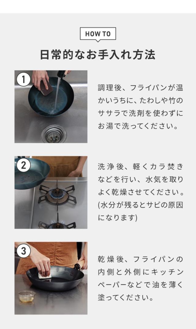 鉄フライパンは正しく使用・きちんとお手入れをすれば、とても長くご使用いただけます。