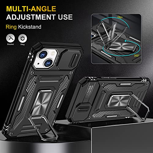 iPhone 14 ケース リング スライド式カメラカバー 耐衝撃 スタンド機能 車載ホルダー レンズ保護 アイフォン14 スマホケース PC TPUバンパー 防塵 人気 落下防止 滑り止め 指紋防止 グレー