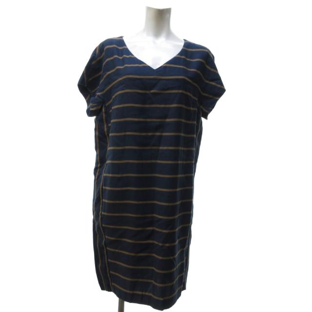 【中古】ドレステリア DRESSTERIOR ボーダー ワンピース ひざ丈 Vネック フレンチスリーブ 紺 茶 F
