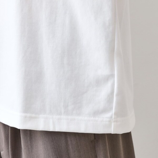 程よい厚みと上品感のあるプレーティング天竺素材を使用し、カジュアルながらきれいめな印象を与えるアイテムです。