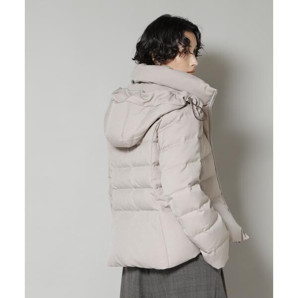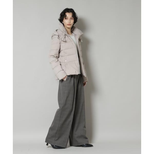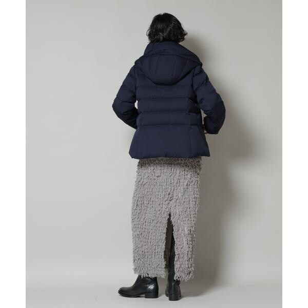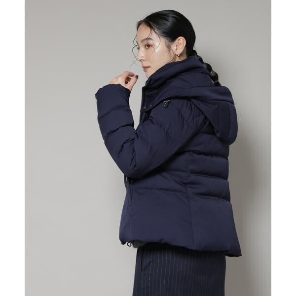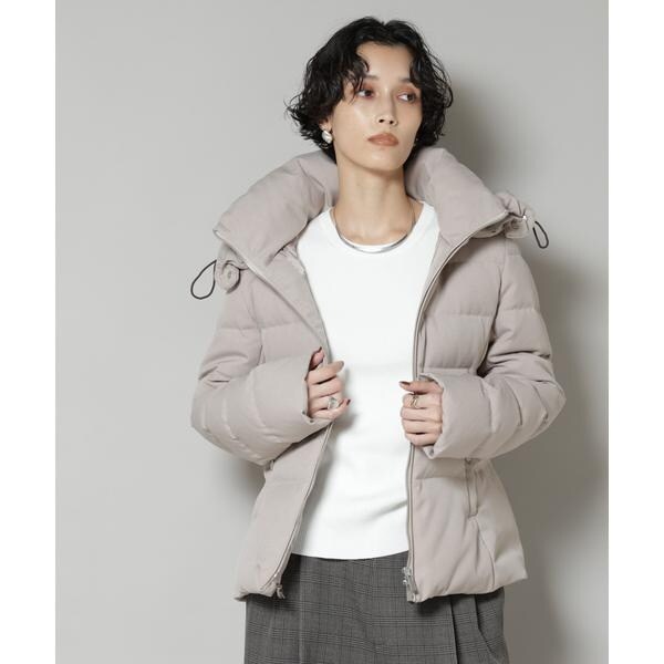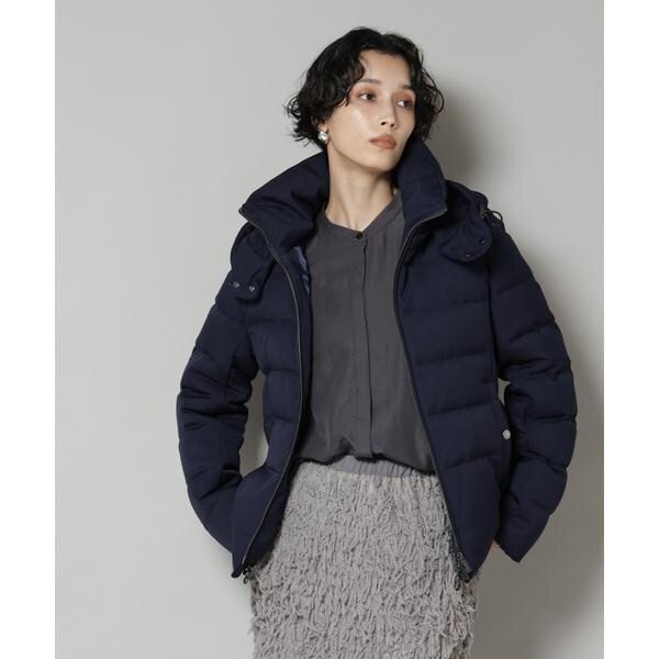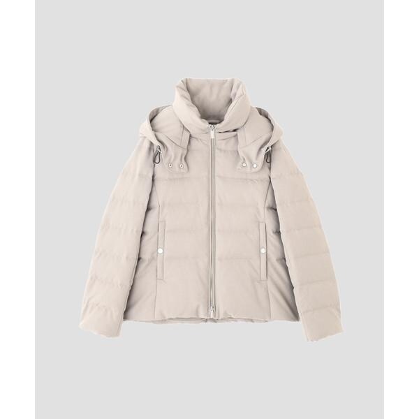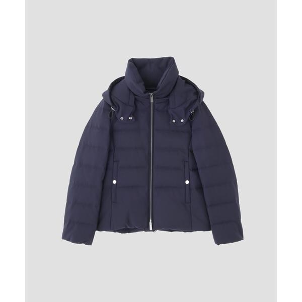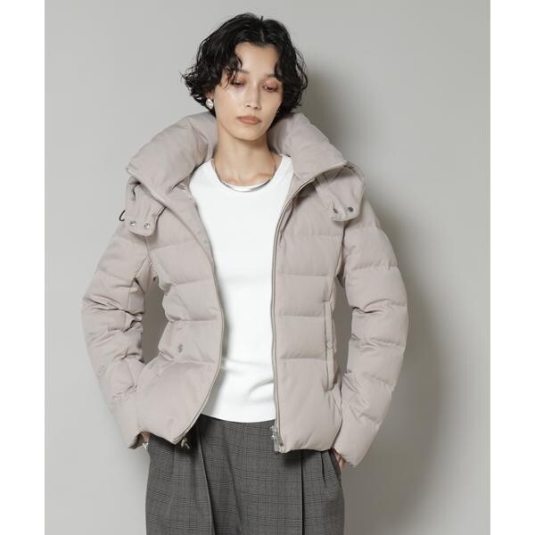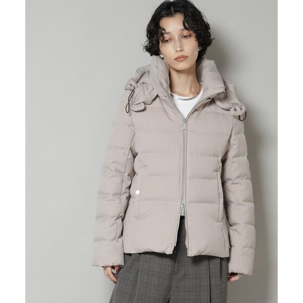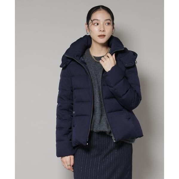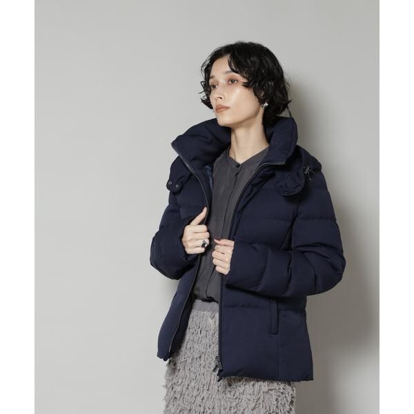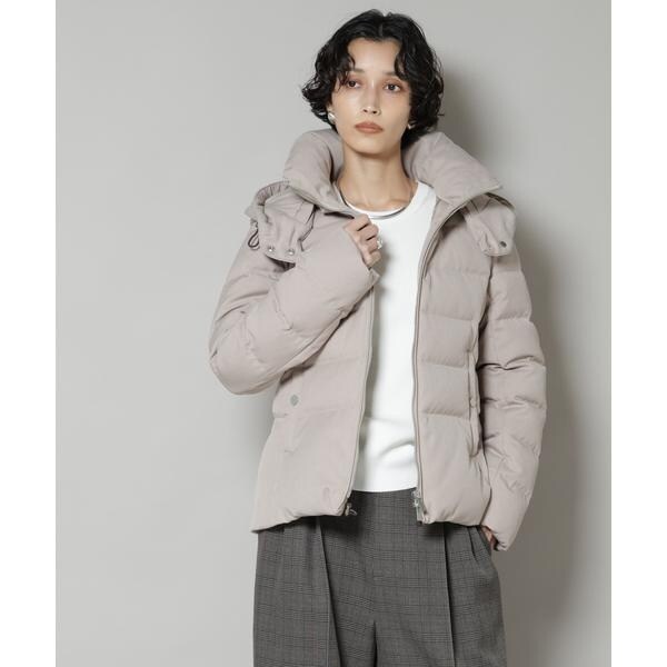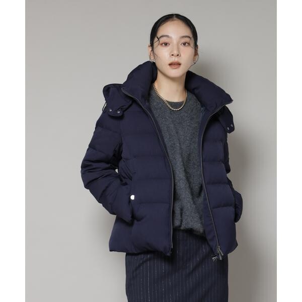 定番人気のサージショートダウン。定番的なデザインだからこそ、よりすっきり女性らしく見えるよう、シルエットやバランスにこだわったアイテム。フードは脱着可能で、スタイルに合わせてスタンドカラーにしたりと変化を楽しめます。