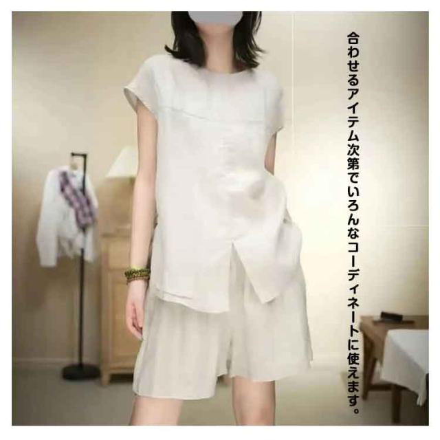 セットアップ レディース ノースリーブ クルーネック ブラウス ショートパンツ フレンチスリーブ 春 夏 上下セット 可愛い 春服 夏服 薄手 おしゃれ かわいい シンプル ボトムス オフィス 通気 上下 2点セット トップス 体型カバー