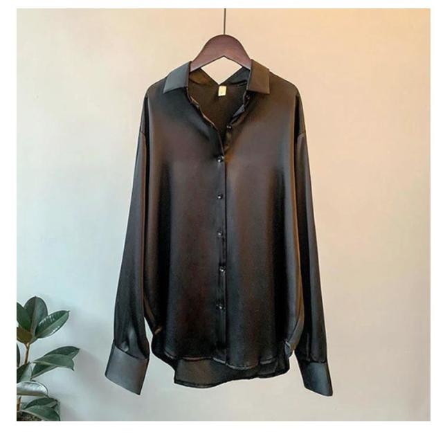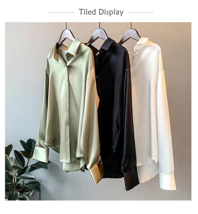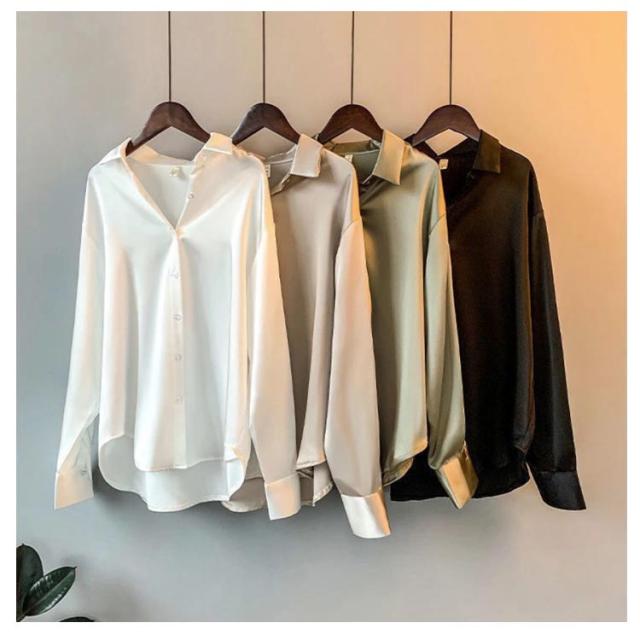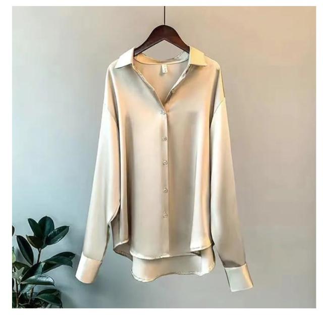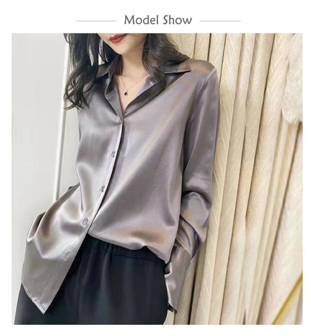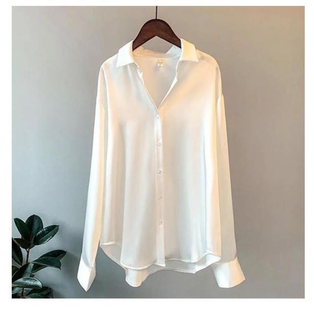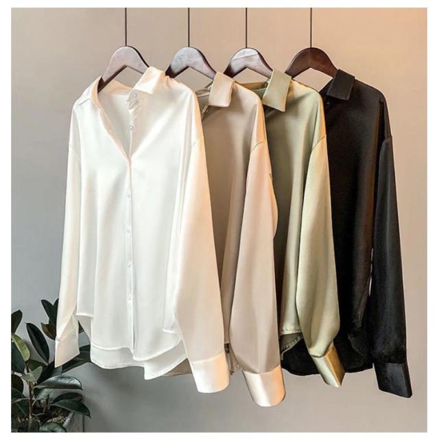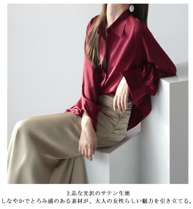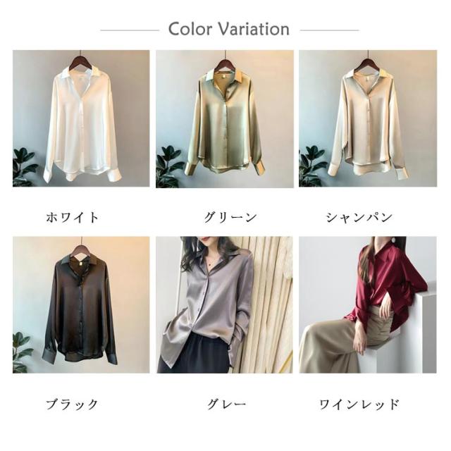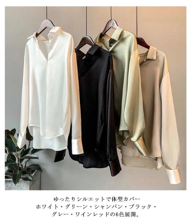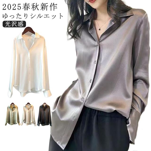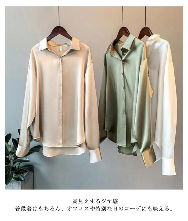 サテンシャツ レディース 長袖 シャツ ブラウス トップス サテン風 光沢感 とろみ シンプル ワイシャツ Yシャツ きれいめ ゆったり 大きいサイズ オフィスカジュアル 通勤 結婚式 20代 30代 40代 50代