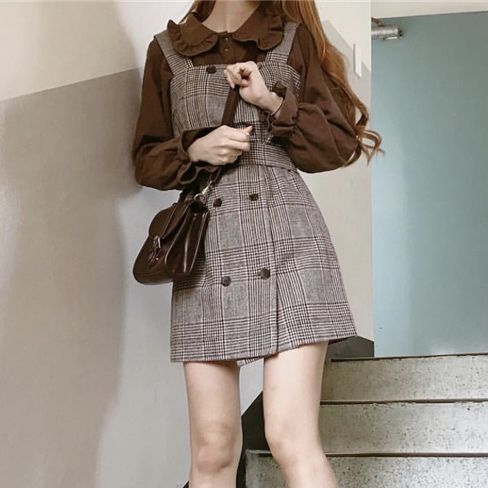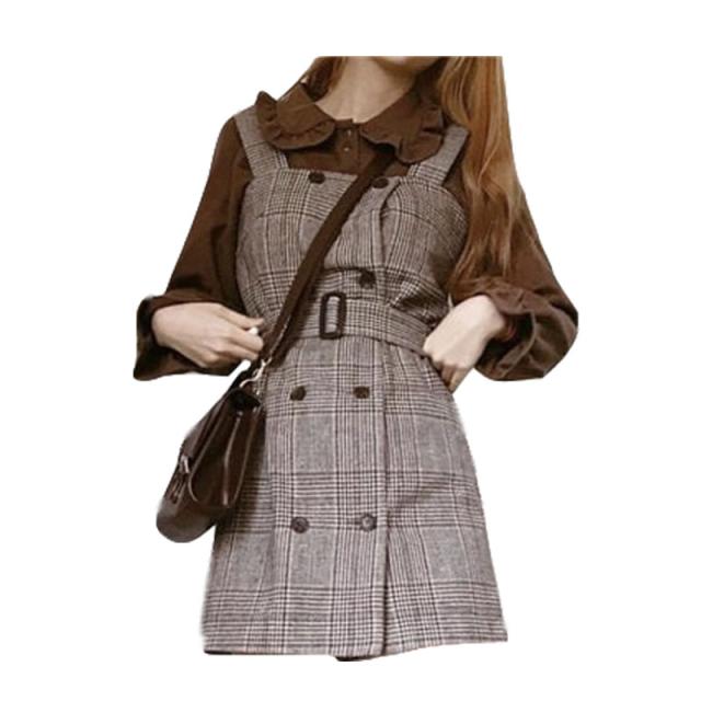 高校生 中学生 10代 20代 ファッション セットアップ チェック柄 ジャンパースカート ワンピース フリル ブラウス ガーリー オータム 4534
