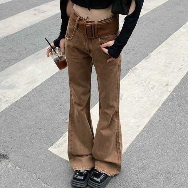 ボトムス デニム パンツ ジーンズ レディース ハイウエスト 個性的 ベルト 裾広がり フレア ブーツカット タイト カジュアル こなれ感 きれいめ 美脚 脚長 着回し クール