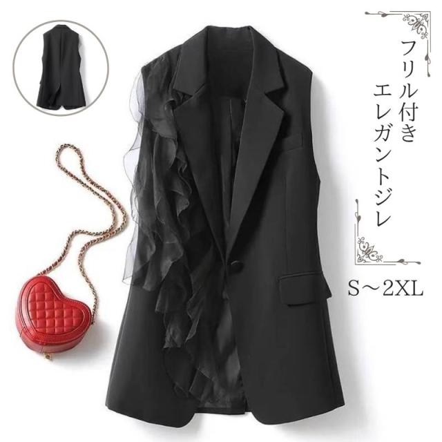 アウター トップス ジレ ベスト レディース ロング フリル 袖なし ノースリーブ 黒 ブラック Vネック 襟付き アシンメトリー 春 夏 秋 個性的 フェミニン 前開き 異素材 かわいい 大人