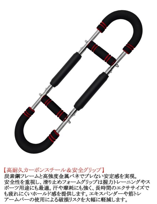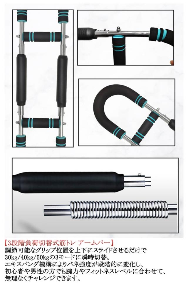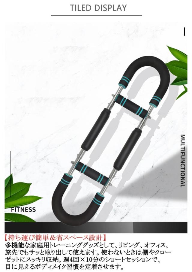 | 多機能腕力トレーナー 3段階調節可能30-50KG 【エキスパンダー内蔵U字型デザイン】筋トレや自宅トレーニングに最適な、コンパクトなU字型トルクロッドに強力エキスパンダーを内蔵し、胸筋・大胸筋・腕・背中・脚・肩を一度に連動刺激できる多機能ニング器具です。エキスパンダー式の可変抵抗が筋繊維をしっかり追い込み、短時間で全身を効率的に鍛え上げます。家庭用グッズとしても省スペースで使えるコンパクト設計。本格的なトレーニングが可能です。 【3段階負荷切替式筋トレ アームバー】調節可能なグリップ位置を上下にスライドさせるだけで30kg/40kg/50kgの3モードに瞬時切替。エキスパンダ機構によりバネ強度が段階的に変化し、初心者や男性の方でも腕力やフィットネスレベルに合わせて、無理なくチャレンジできます。 【高耐久カーボンスチール&安全グリップ】炭素鋼フレームと高強度金属バネでブレない安定感を実現。安全性を重視し、滑り止めフォームグリップは握力トレーニングやスポーツ用途にも最適。汗や摩耗にも強く、長時間のエクササイズでも疲れにくいホールド感を提供します。エキスパンダーや筋トレ アームバーの使用による破損リスクを大幅に軽減します。 【持ち運び簡単&省スペース設計】多機能な家庭用トレーニンググッズとして、リビング、オフィス、旅先でもサッと取り出して使えます。使わないときは棚やクローゼットにスッキリ収納。週4回×10分のショートセッションで、目に見えるボディメイク習慣を定着させます。 【多彩なエクササイズバリエーション】エキスパンダー&筋トレ アームバー機能により、二の腕やストレッチ、シェイプアップなど幅広いフィットネスに対応。プッシュアップ、ベンチプレス、ローイング、スクワットなど多岐にわたるトレーニングが可能。1台で部位別集中から全身ワークアウトまで幅広くカバーし、飽きずに継続できるホームジムをサポートします。 | |