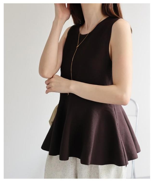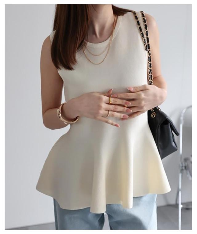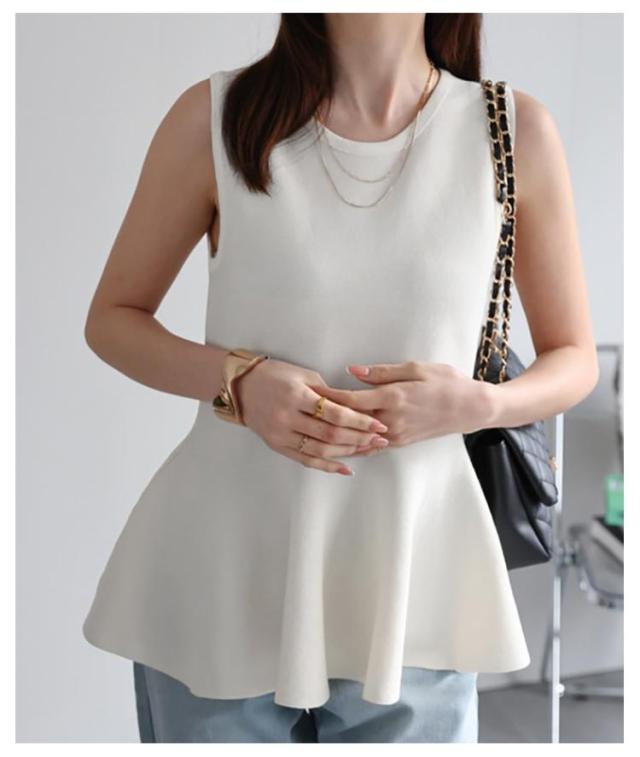 ペプラムトップス ペプラム ノースリーブ トップス 春 ノースリーブニット ニット きれいめい トップス 秋 レディース フレア フリル クルーネック プルオーバー 夏 ノースリーブトップス フレアトップス フィット サマーニット 大人 春夏 春
