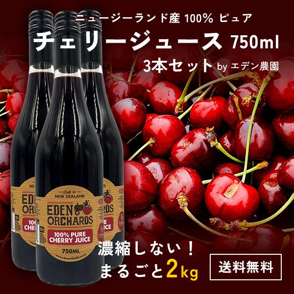 100% ピュア チェリージュース 750ml ×3本 エデン農園 チェリー2kg分使用 ニュージーランド産 非濃縮 無添加 砂糖不使用 ぐっすりすっきり習慣に