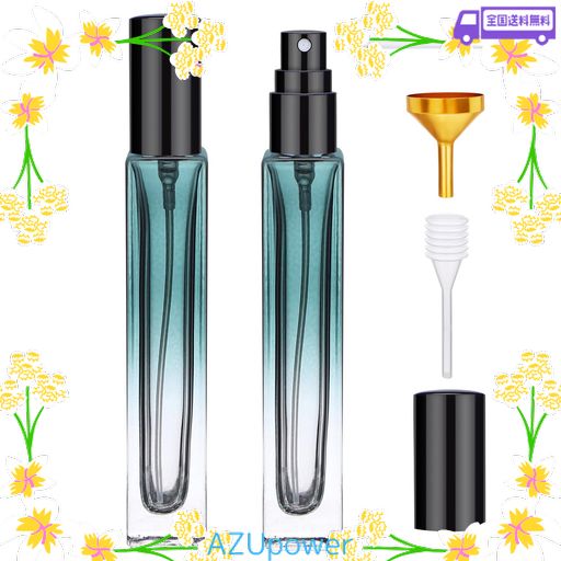 【詰め替え用付属品付き】香水瓶などから香水を入れ替える際に便利な付属品をセットでお付けします。アトマイザー*2点+プッシュノズル*1点+スポイト*1点+漏斗*1点。容量:10ml、カラー:グリーン グラデーション。