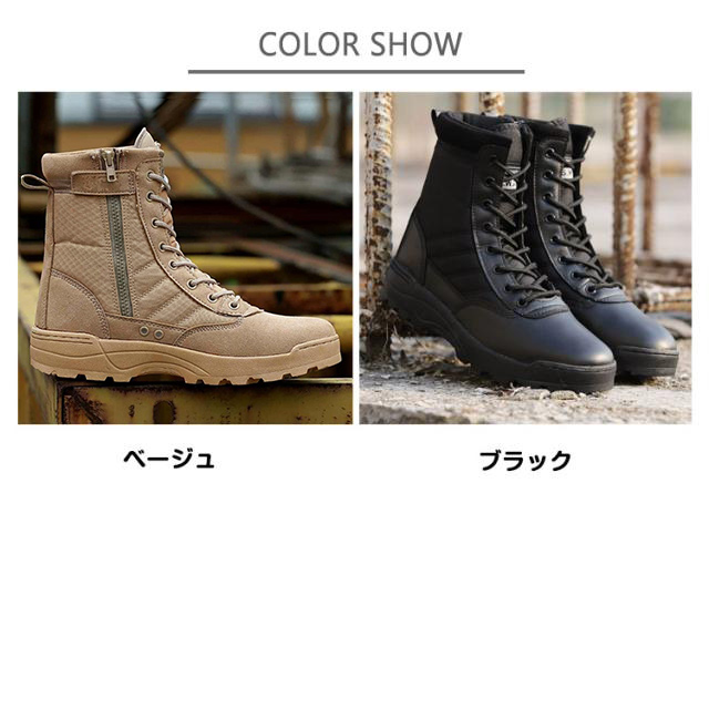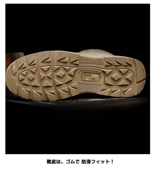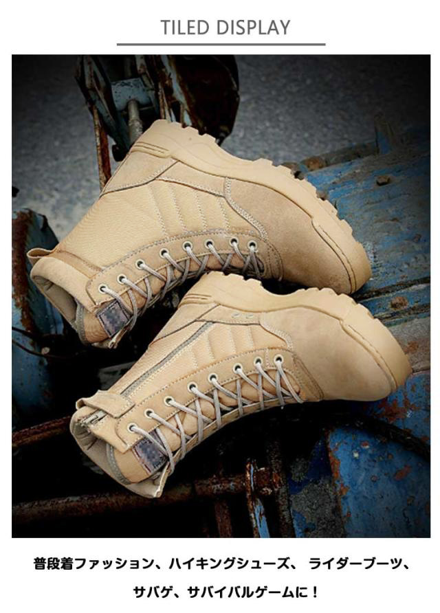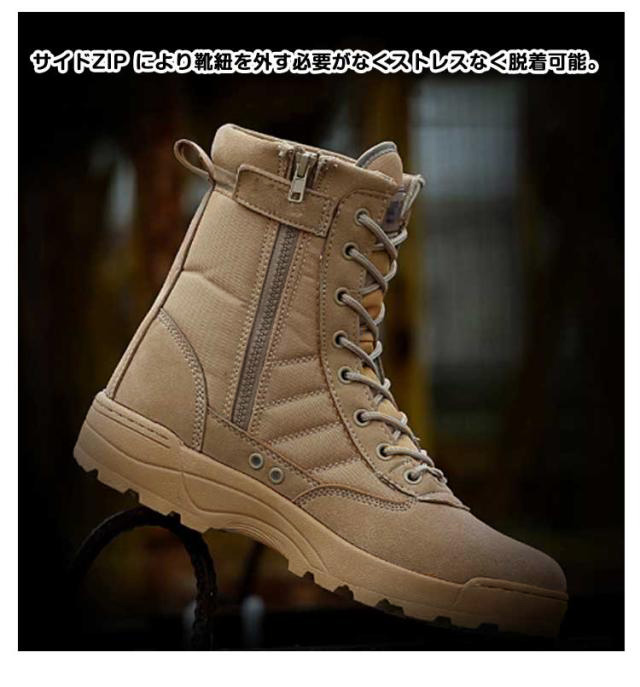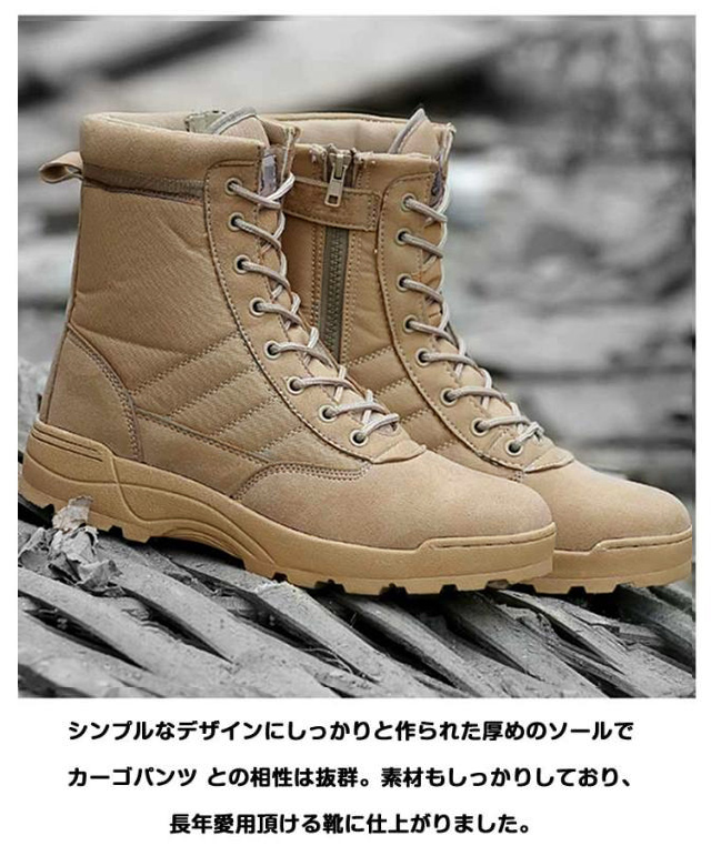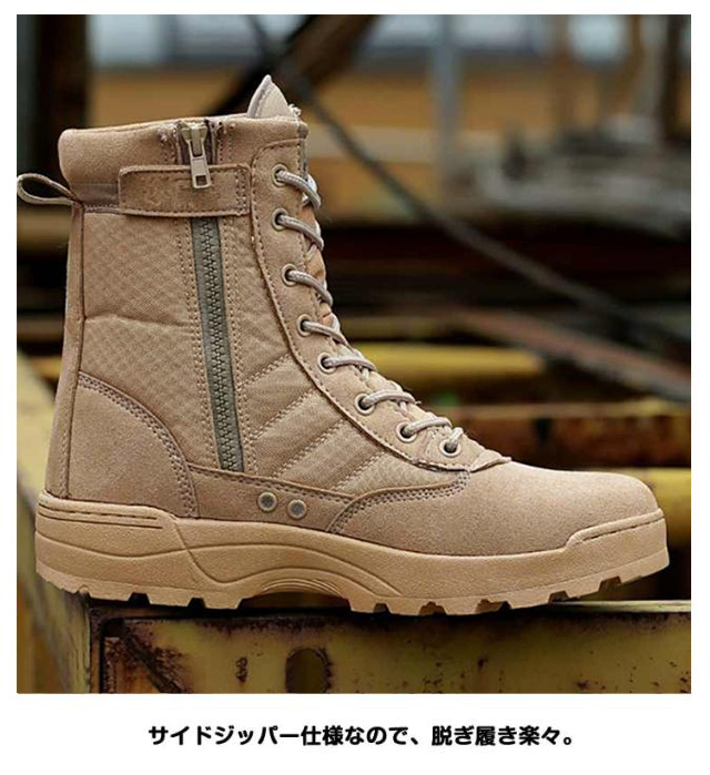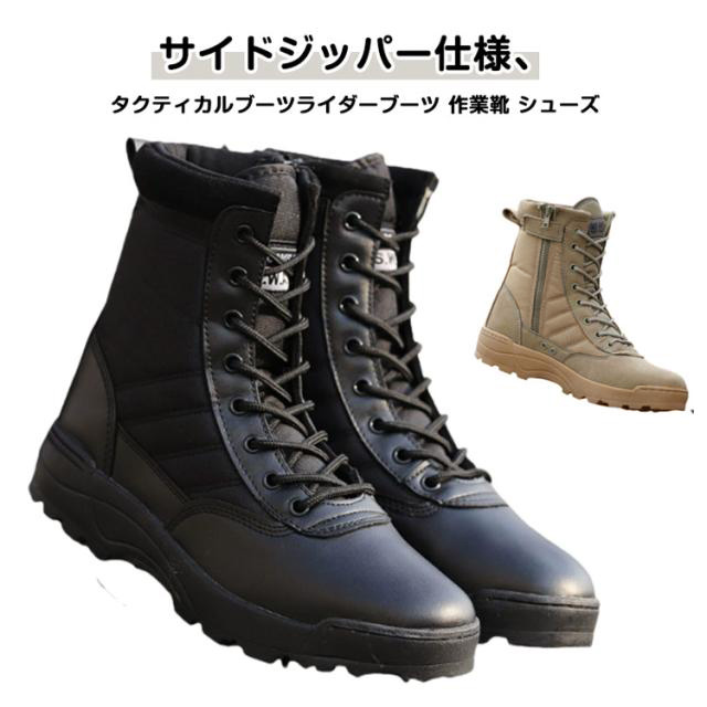 | サイドジッパー仕様、タクティカルブーツ ライダーブーツ 作業靴 シューズ サイドZIP により靴紐を外す必要がなくストレスなく脱着可能。 靴底は、ゴムで 防滑フィット! サイドジッパー仕様なので、脱ぎ履き楽々。 シンプルなデザインにしっかりと作られた厚めのソールで カーゴパンツ との相性は抜群。素材もしっかりしており、長年愛用頂ける靴に仕上がりました。 普段着ファッション、ハイキングシューズ、 ライダーブーツ、 サバゲ、サバイバルゲームに! | |