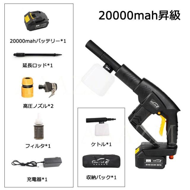 20000mah昇級:20000mahバッテリー*1 フィルタ*1 高圧ノズル*2 充電器*1 延長ロッド*1 ケトル*1 収納バック*1