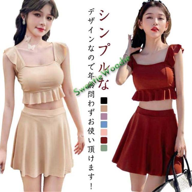 フリル レディース スカート 水着 セパレート 水着 韓国 無地 小胸 体型カバー タンキニ 水着 タンキニ 露出控えめ 可愛い 上下セット タンキ