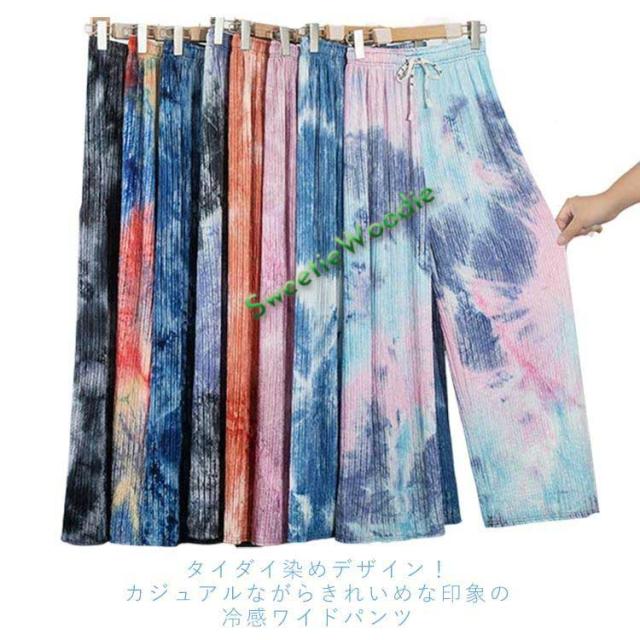 接触冷感 柄パンツ タイダイ柄 プリーツパンツ ウエストゴム 薄手 レディース 冷感パンツ カジュアル 夏物 ゆったり ロングパンツ お洒落 接触冷感