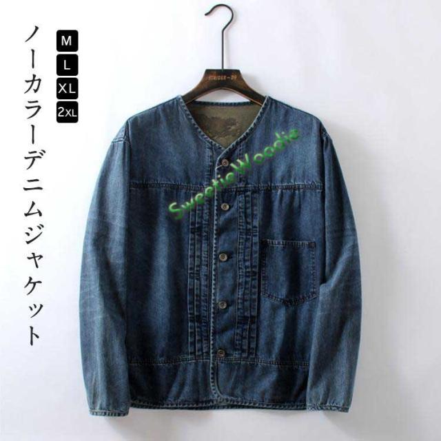 デニム 薄手 ライトアウター Gジャン ノーカラー 羽織り ジャケット メンズ 前開き ルーズシルエット ゆったり アメカジ カジュアル ストリート