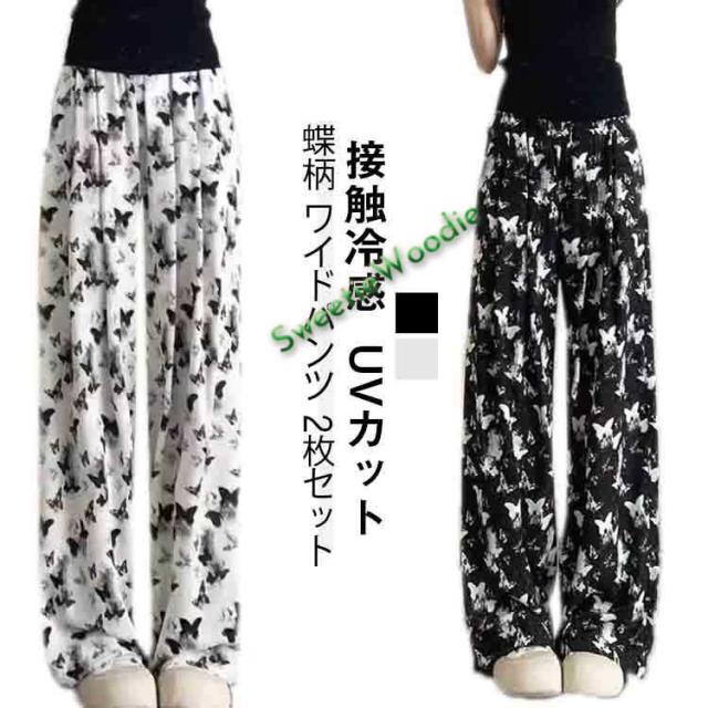 2枚セット 蝶柄 接触冷感 レディース UVカット イージーパンツ ストレッチ 涼しい 薄手 ワイドパンツ ウエストゴム 柄パンツ ボトムス 春夏