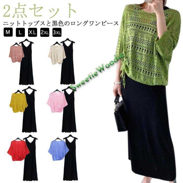 ロング丈ワンピース オシャレ ニットトップス 半袖 夏 2点セット ゆったり レディース 薄手 ニット 透かし彫り 黒ワンピース マキシ丈 ロング丈