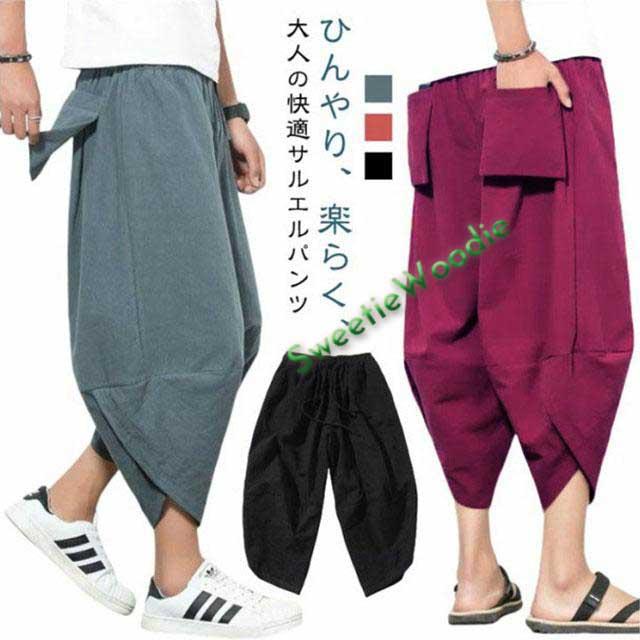 ぱんつ ゆったり メンズ 大きいサイズ サルエルパンツ ズボン ワイドパンツ 夏用 7分丈 ボトムス 麻 ひざ下 リネン イージー 涼しい サルエルパ