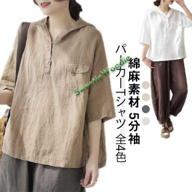 無地 五分袖 パーカー 綿麻 涼しい tシャツ Tシャツ コットンリネン プルオーバーパーカー フード付き 薄手 大きいサイズ Tシャツ 半袖 春夏