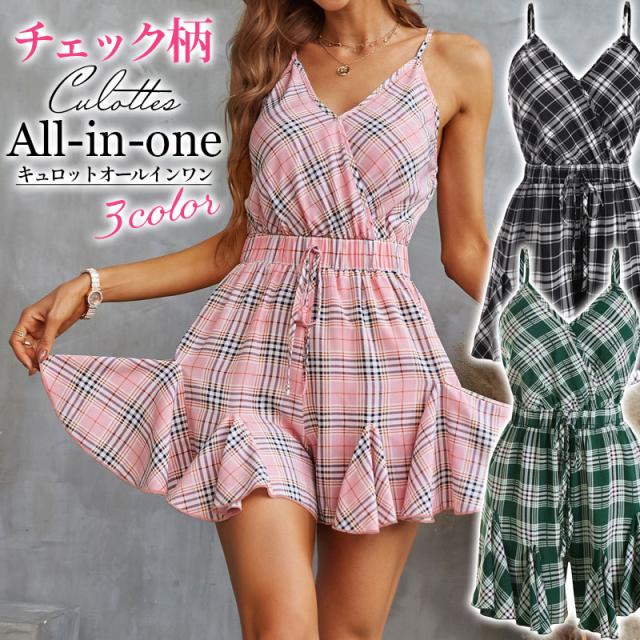 チェック柄 ワンピース レディース 春 夏 オールインワン フリーサイズ フリルスカート ショートパンツ キュロット ショート丈 膝上 ノースリーブ かわいい セクシー シンプル