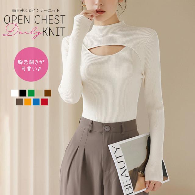 胸元 セクシー ニット セーター レディース 長袖 ざっくり タートルネック リブ編み 胸元開き 胸開き ロンT インナー あったか 秋冬 薄手ニット フリーサイズ 編み込み シンプル ベーシック