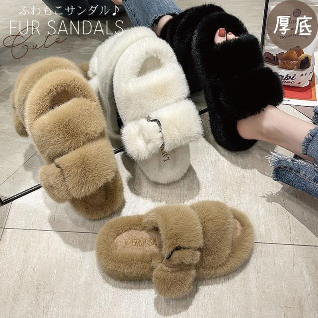 ファーサンダル 厚底 レディース ベルト スリッパ ルームシューズ シャワーサンダル 歩きやすい 履きやすい フラットソール フラットシューズ スリッポン もこもこ かわいい 秋送料無料