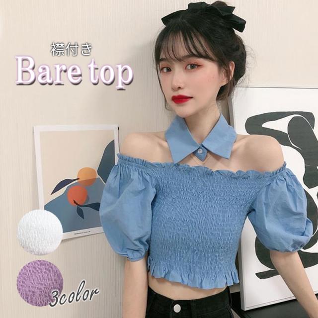 Tシャツ 襟付き ベアトップ レディース シャーリング ブラトップ フリーサイズ パフスリーブ 袖付き ボリューム ダンス衣装 かわいい トップス セクシー 韓国ファッション メール便送料無料