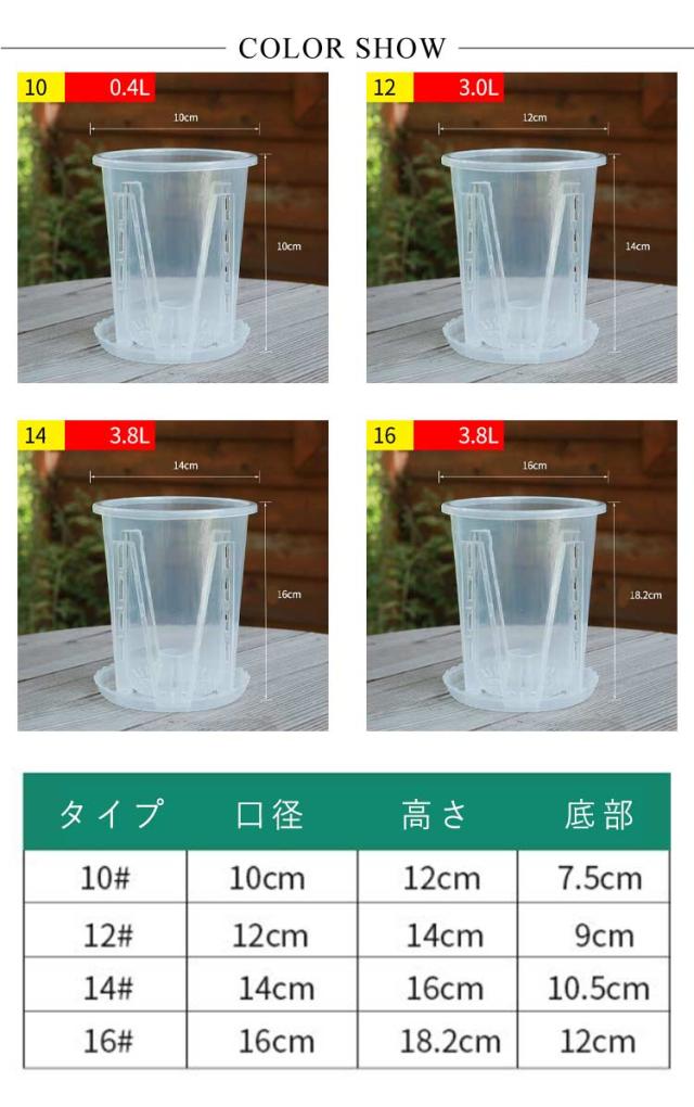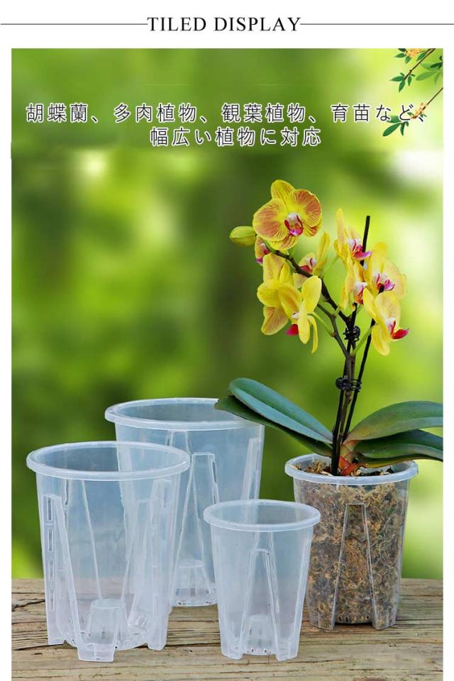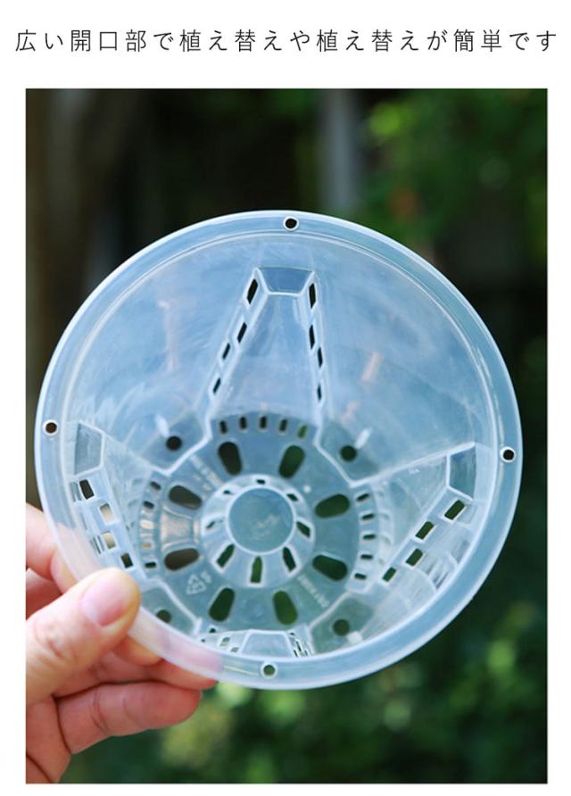 | 観葉植物も多肉も蘭もOK!プラスチック鉢の5点セットです。 底部に穴が開いているため、過剰な水分がスムーズに排出できます。 透明なデザインなので根の成長や水分量の確認が簡単です。 広い開口部で植え替えや植え替えが簡単です。 受け皿付きなので、水やり後も周りを汚しにくく、ベランダや室内でも清潔に使えます。 胡蝶蘭、多肉植物、観葉植物、育苗など、幅広い植物に対応。 | |