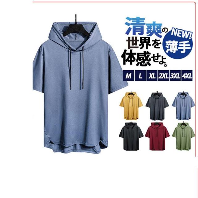 【ポイント10倍!】半袖パーカー メンズ 夏用 薄手 ゆったり Tシャツ 春 夏 春服 夏服 スポーツ プルオーバー 大きいサイズ フード付き カジュアル 通勤