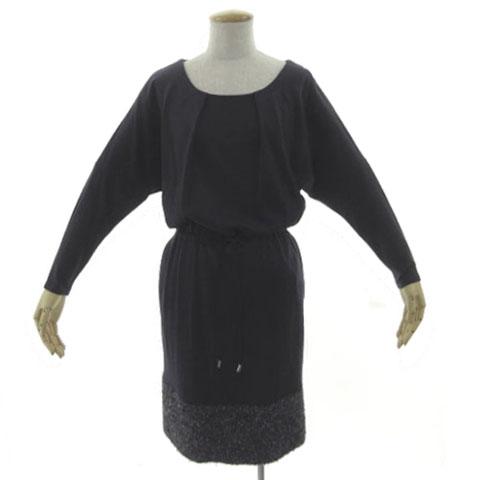 【中古】アンタイトル ワンピース タック 長袖 ひざ丈 ウエストゴム ツイード切替え 起毛 パープル系 紫系 黒 白 1