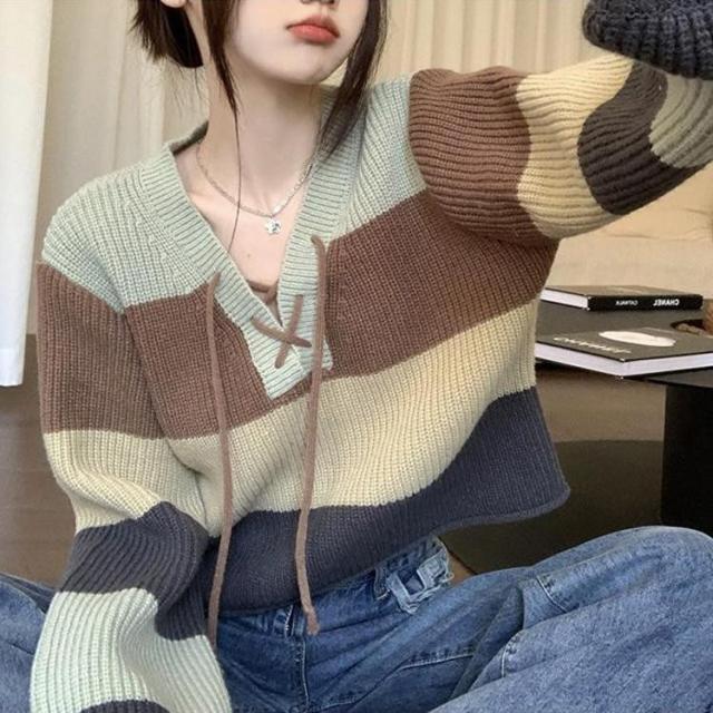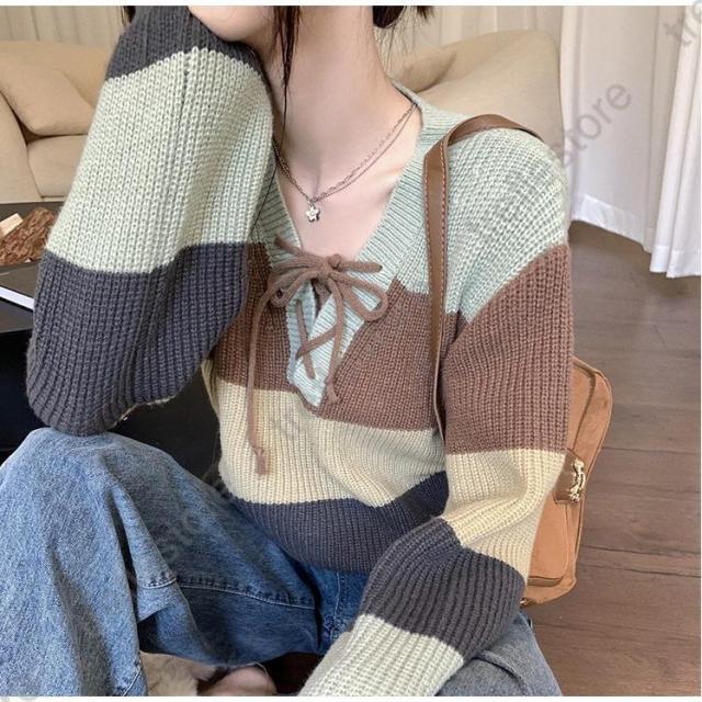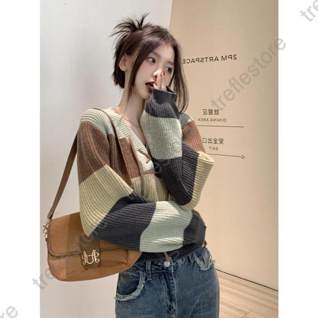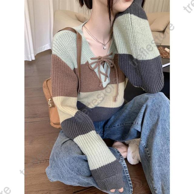 【ポイント10倍!】ニットセーター レディース 秋冬 長袖トップス Vネックセーター ボーダー柄ニットトップス ニットインナー プルオーバー ゆったり 風 カジュアル
