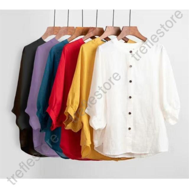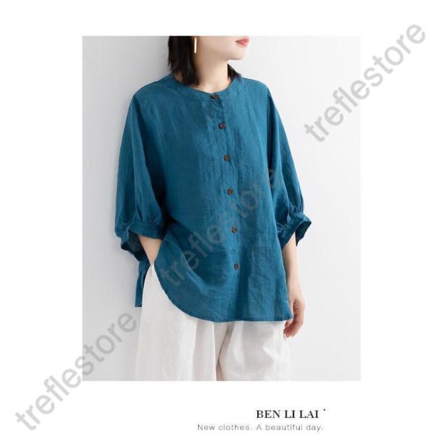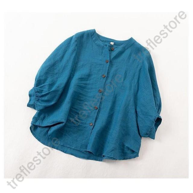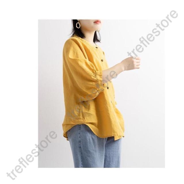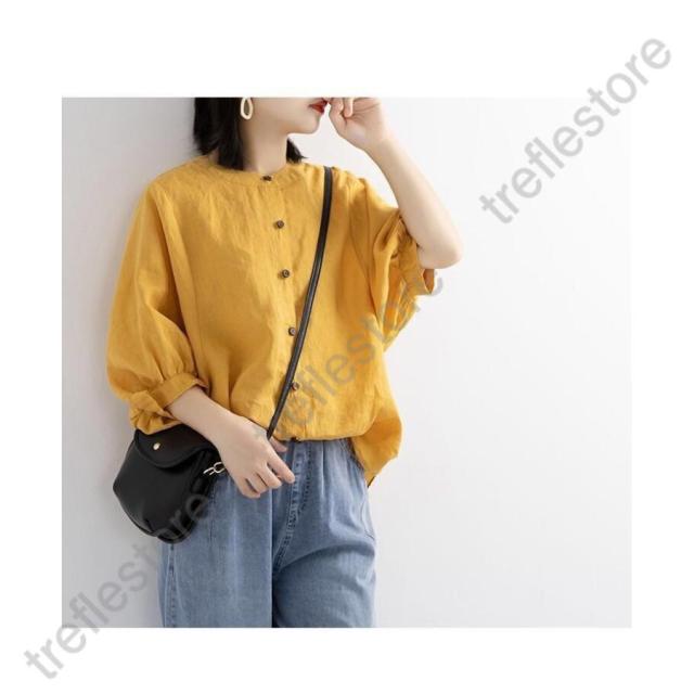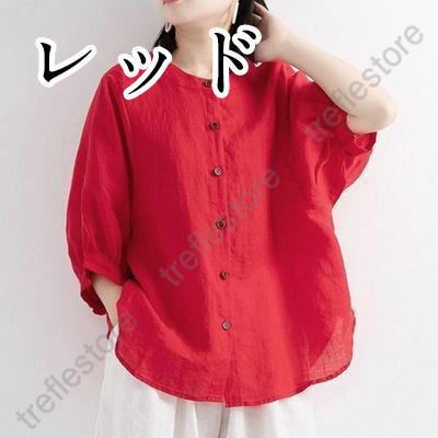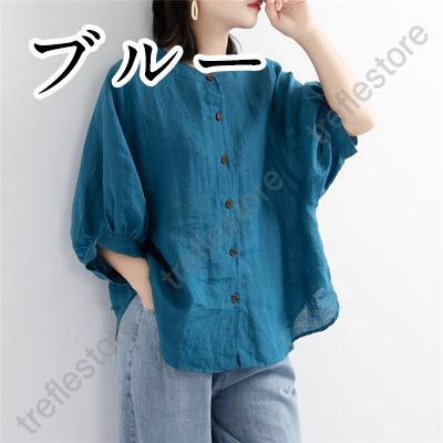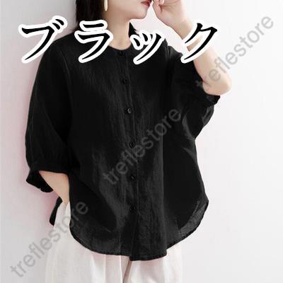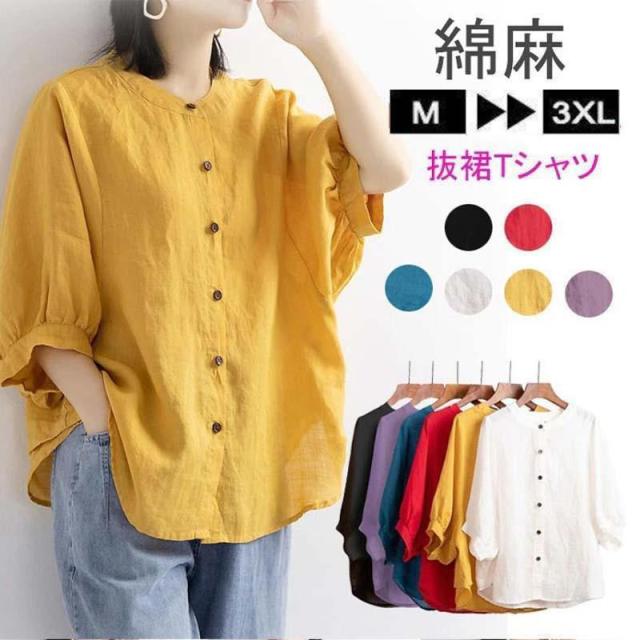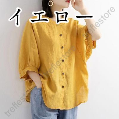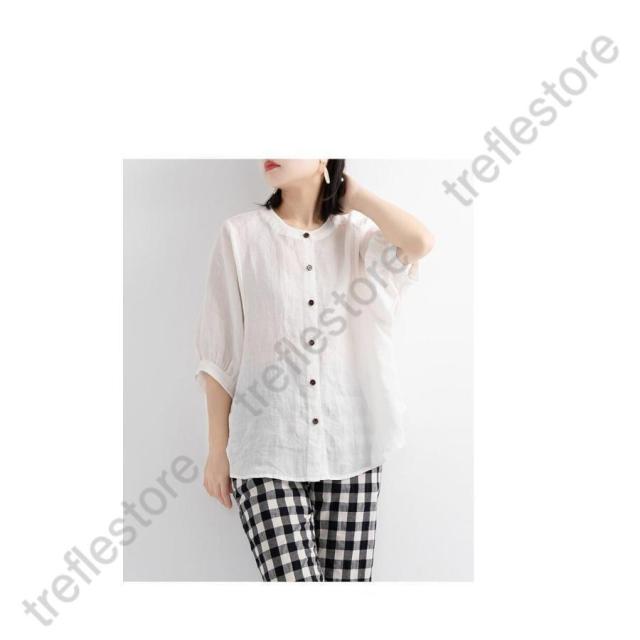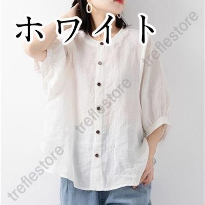 【ポイント10倍!】レディース 丸襟 半袖 リネンシャツ ブラウス 夏 トップス カジュアル 無地 ナチュラル 春 羽織り シャツ 大きいサイズ 体型カバー