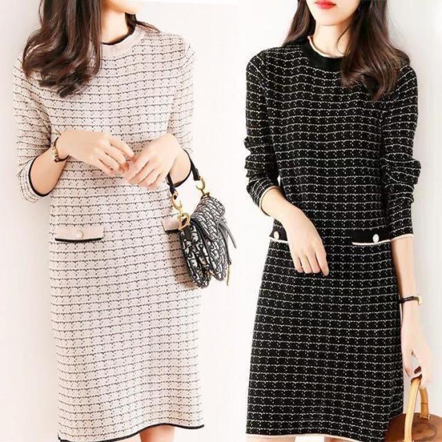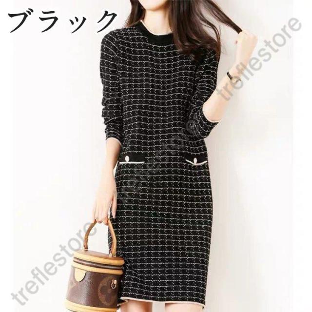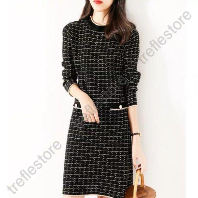 【ポイント10倍!】ニットワンピース レディース 秋冬 膝丈 ワンピース 厚手 きれいめ チェック 上品 ワンピース 大人 お出かけ 30代 40代 50代 通勤 着痩せ